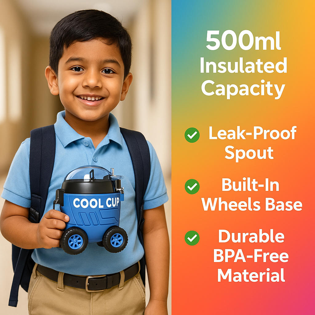 Our Cool Cup combines functionality with fun. The sturdy leakproof lid and flexible straw mean zero-mess sipping, while the lovable car motif sparks imagination with every drink. Its large capacity keeps you hydrated longer, and the lightweight, rugged build stands up to all your adventures.